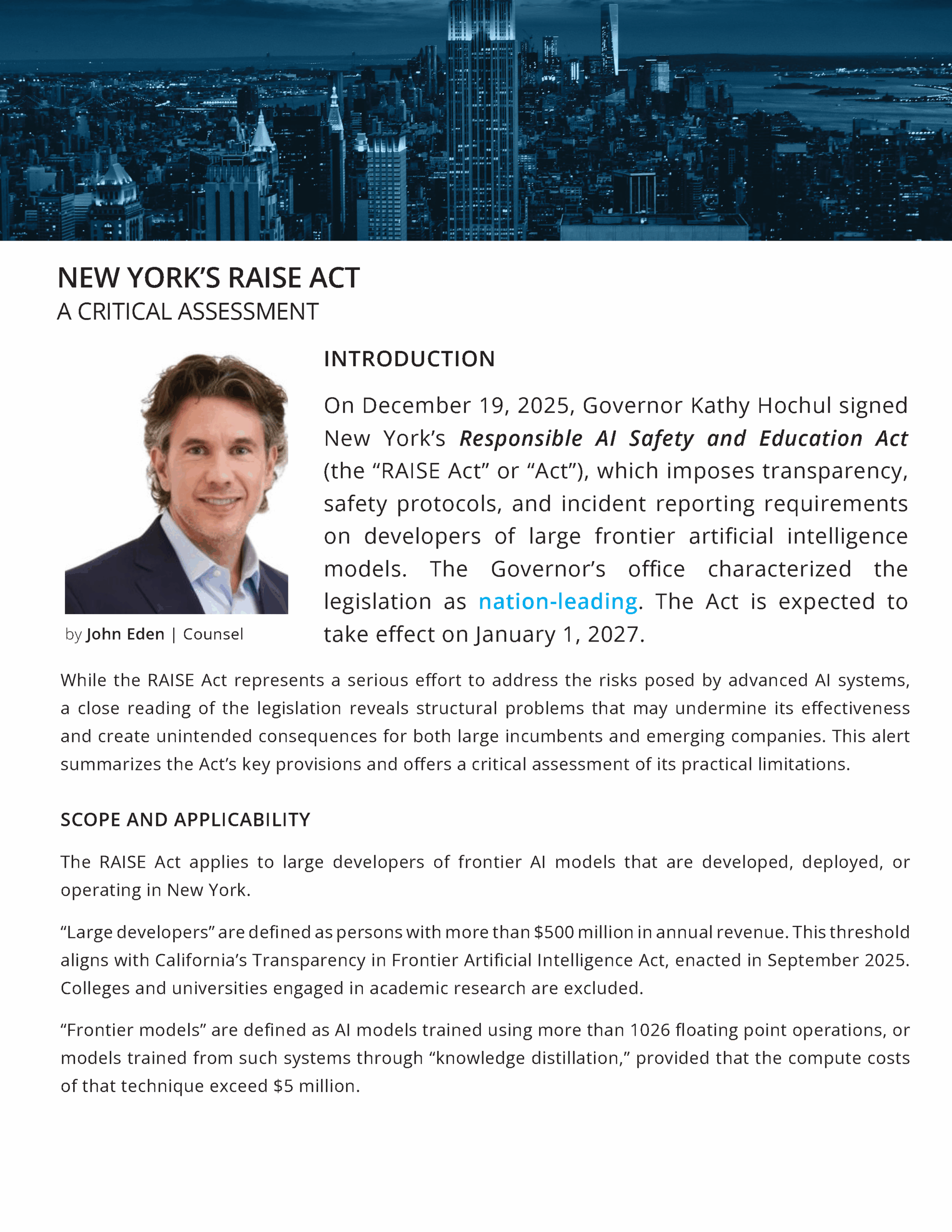 On December 19, 2025, Governor Kathy Hochul signed New York’s Responsible AI Safety and Education Act (the “RAISE Act” or “Act”), which imposes transparency, safety protocols, and incident reporting requirements on developers of large frontier artificial intelligence models. The Governor’s office characterized the legislation as nation-leading. The Act is expected to take effect on January 1, 2027.